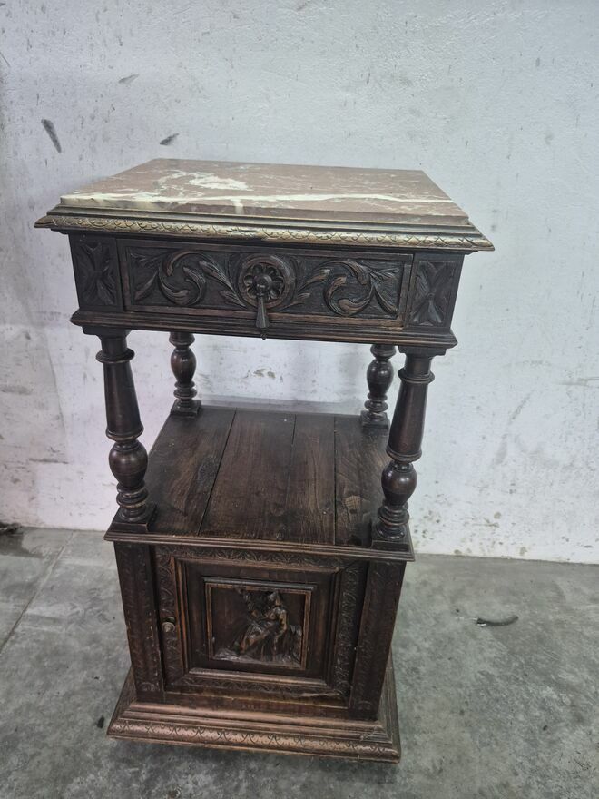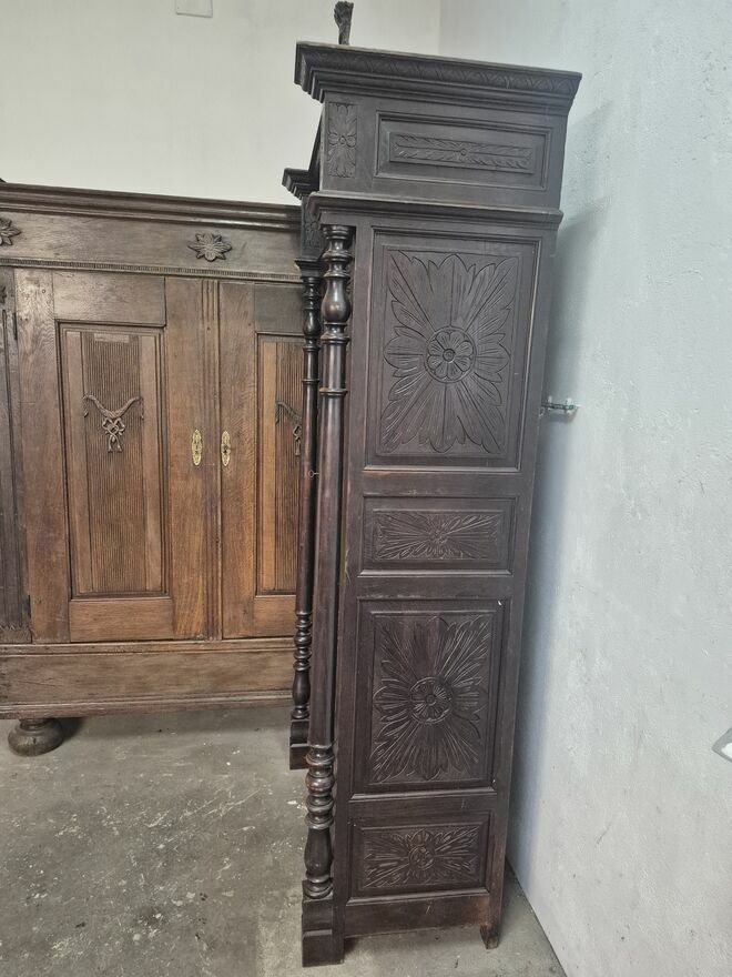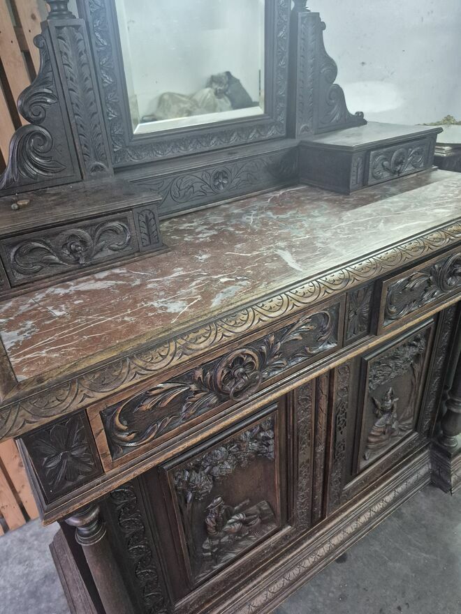 Piękna, kompletna antyczna bretońska sypialnia składająca się z łóżka, przestronnej szafy, komody - toaletki i pasującego stolika nocnego. Zestaw wykonany jest z dbałością o szczegóły i posiada piękne rzeźby, charakterystyczne dla stylu bretońskiego.Składające się z: