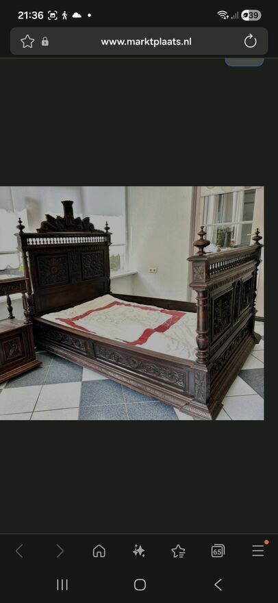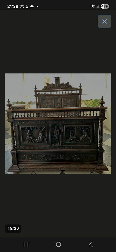 - łóżko z bogato zdobionymi rzeźbami rzemieślniczymi,